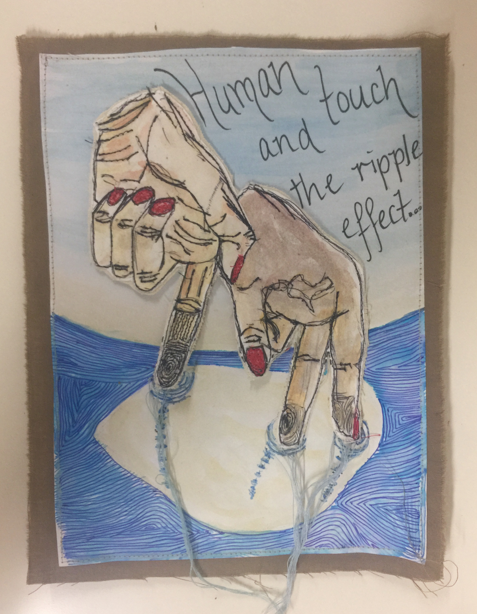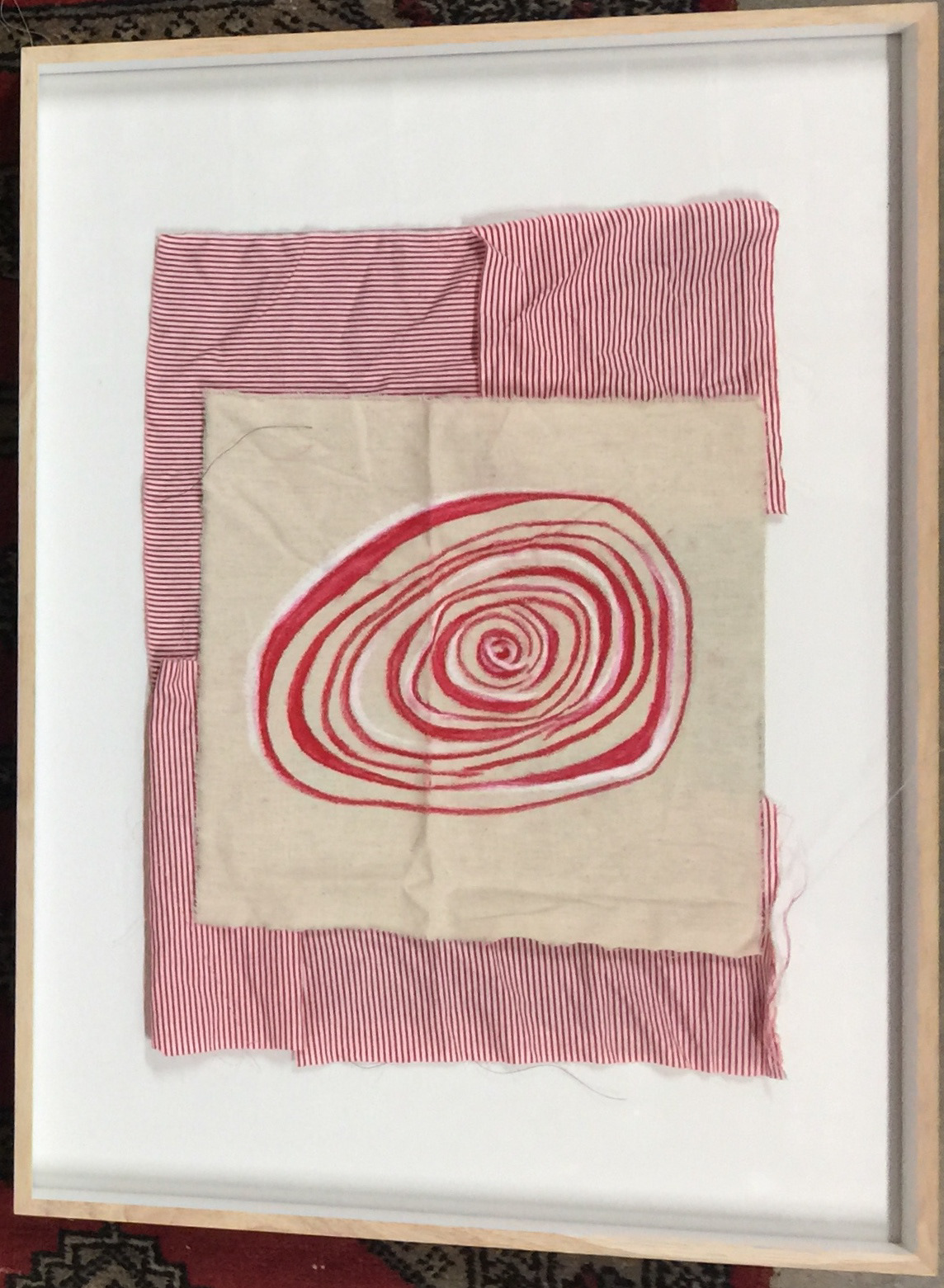 My last artwork encapsulates an abstract interpretation of distorted rings. I have used red crayon on calico fabric to create the rings and then sewed this material onto white and red striped cotton fabric. I wanted to show a juxtaposition of the round ring motion against a strong horizontal stripe.