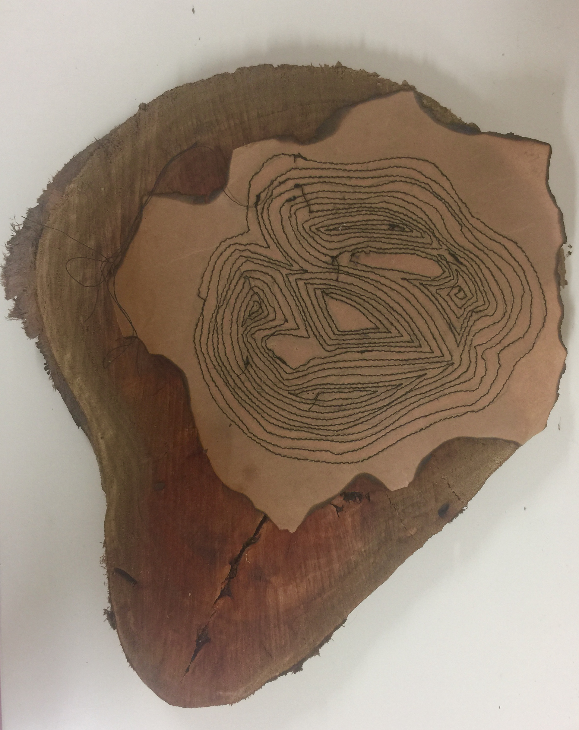 Artwork 2. The organic rings were sewed on paper and then placed on a piece of wood, which had originally been sawed from the bottom of the wood sculpture itself. This artwork was intended to demonstrate the organic shapes in tree rings and how they all give off an effect of an illusion through its use of repetitive circular lines.